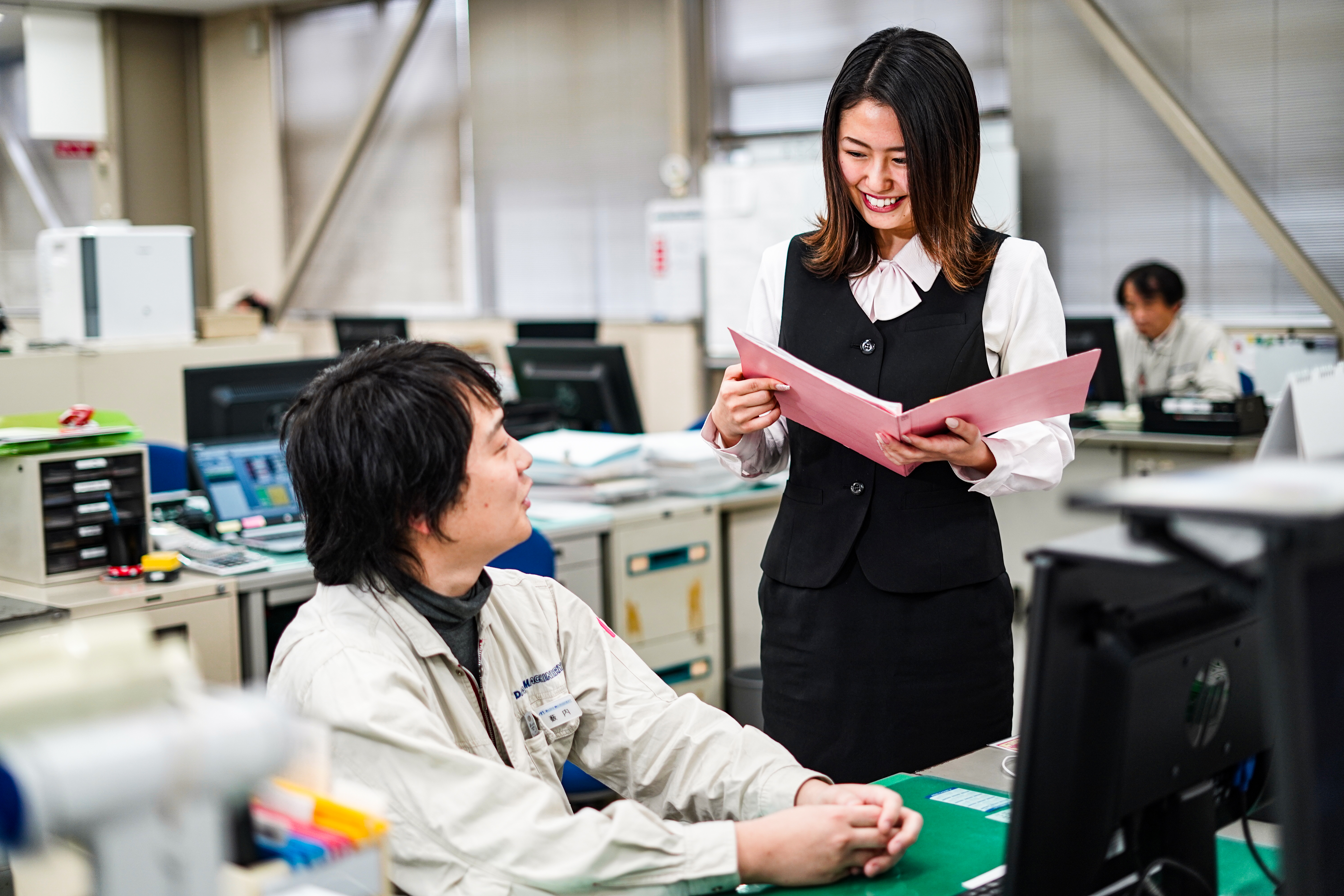 大同マシナリーとは、どんな会社か質問した。「働きやすい環境だと思います。」彼女の口からは至ってシンプルな一言が返ってきた。その言葉に込められた思いを聞いた。もともと、文系出身だった彼女にとって、入社当時はたくさんの壁があった。社内に飛び交う専門用語や調達先の数々に戸惑う日々。「それでも、周囲の先輩方は懇切丁寧に教えてくれたので、自然と覚えていくことができたんです。」大同マシナリーの“人柄の良さ”が、今も彼女を成長に導いている。事務と現場の職場も近く、部署を横断してさまざまな社員とコミュニケーションを取れる。そんな環境だからこそ、日々刺激を受けながら、成長していけると実感している。彼女にとって「働きやすい環境」というのは、“成長しやすい”だけではない。「もちろん仕事で活躍したい。でも、家庭との両立もしたいんです。」産休・育休制度をはじめとした福利厚生が整っているのも、彼女にとっての「働きやすい環境」に込められた意味だ。